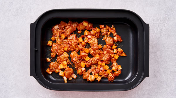 STEP 02将蔬菜丁、鸡肉丁、番茄酱、蒜蓉、甜椒粉、10g橄榄油拌匀放入深锅 -