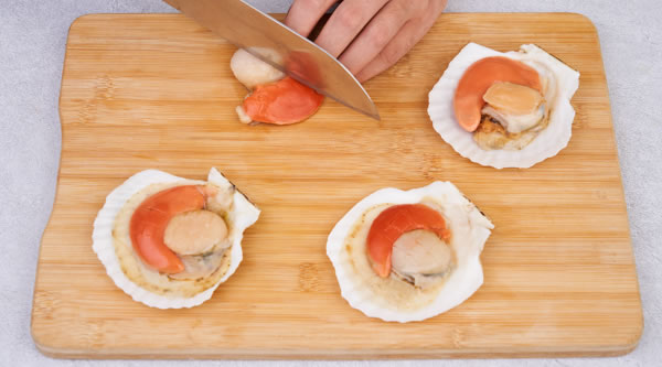 STEP 02扇贝洗净去半壳,吸干表面水份,正反面开花刀使其入味 -