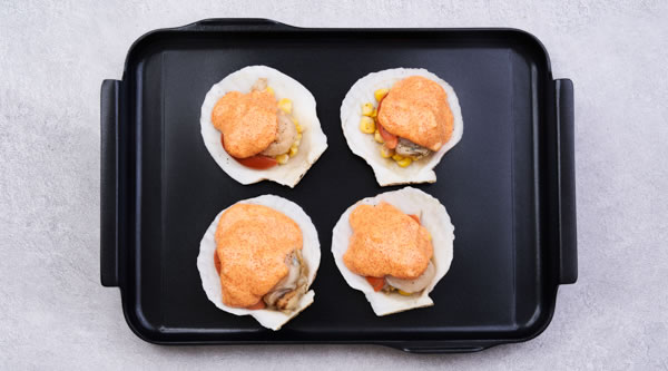 STEP 03每只底壳放10g玉米粒,放入扇贝肉,研磨黑胡椒,顶部放上约30g明太子酱 -