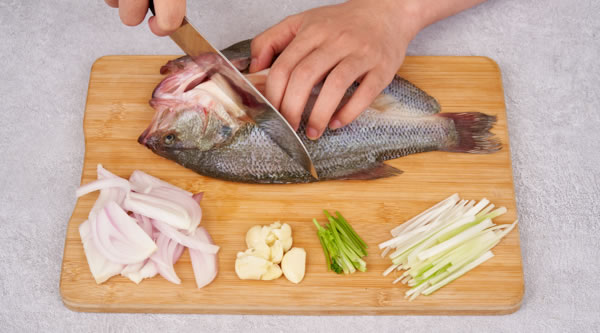 STEP 01洋葱、京葱切丝、香菜梗切2cm段、去皮蒜瓣拍扁,鲈鱼表面改花刀 -