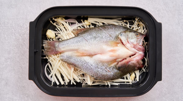 STEP 02取深盘倒入10g油,洋葱丝、蒜、金针菇铺底,将鲈鱼平铺在上面,沿锅边淋5g油 -