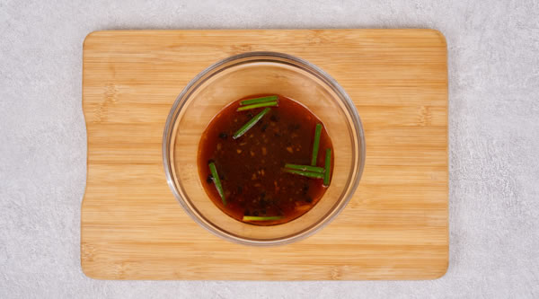 STEP 04将蒜蓉酱、干豆豉、家乐香辣酱、水、生抽、糖和小葱段搅匀为酱汁 -
