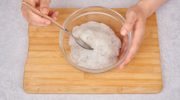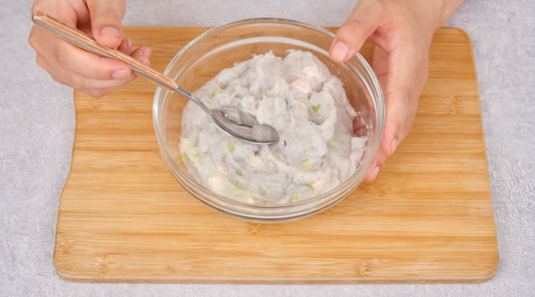 STEP 01虾仁加入盐、糖、蛋清、生粉打成泥状 -