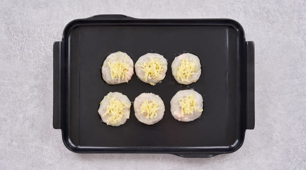 STEP 03浅盘刷橄榄油,取35g虾泥搓成球后压成虾饼,6个虾饼居中放置浅盘中央位置,每个虾饼表面放3g的马苏里拉 -