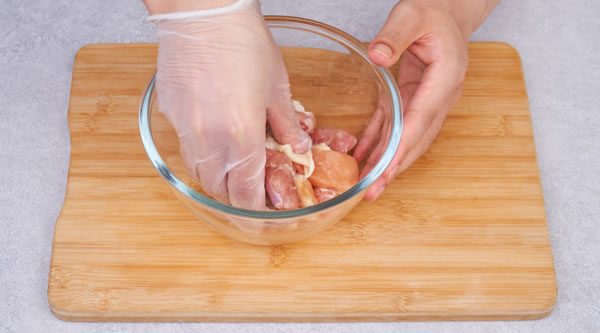 STEP 01鸡腿排切成2*5块状,加盐抓一下静置片刻 -