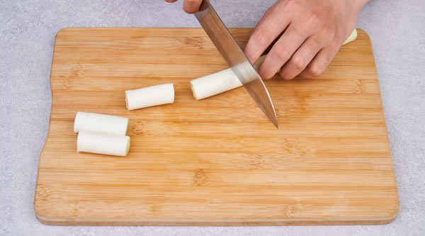 STEP 02京葱去两层表皮,洗净切成5cm长段状 -