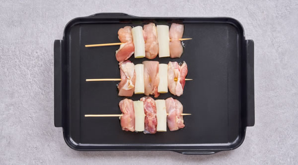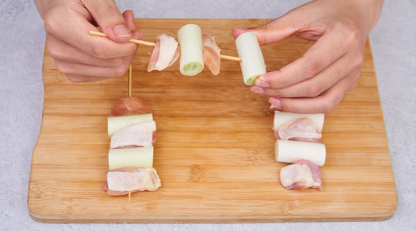 STEP 03将腿排对折串入粗竹签,串一个京葱段,每串上串3块肉,2段葱 -