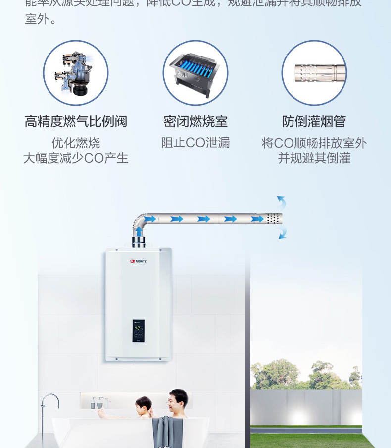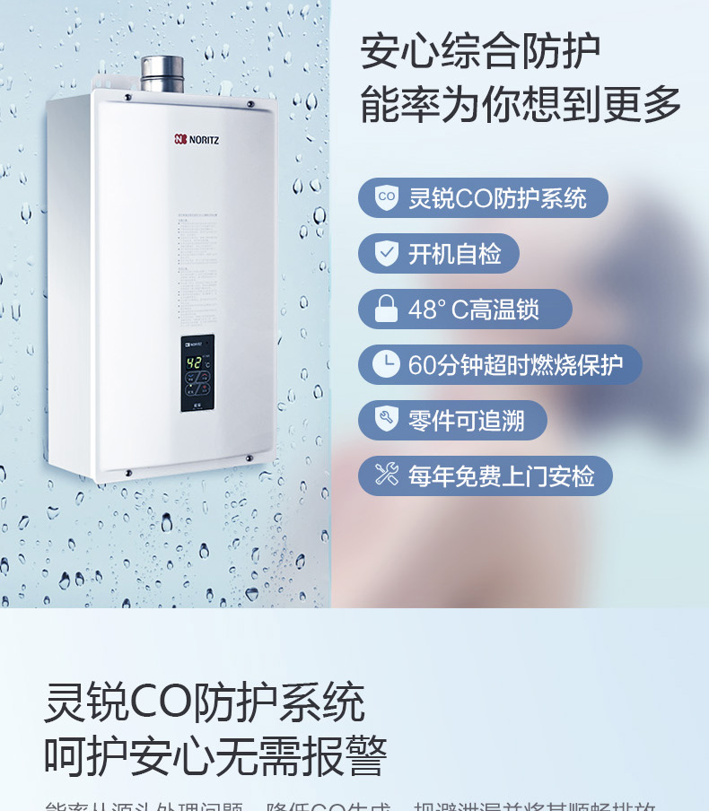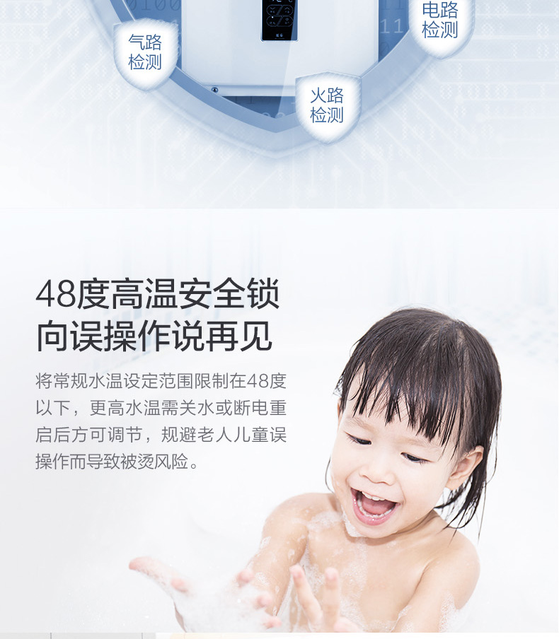安全装置:熄火保护,过压保护,可复式空烧保护,水、气路过滤,熔断式过热保护,LED数码故障显示,断水保护,防雷击保护,双重燃气电磁阀等