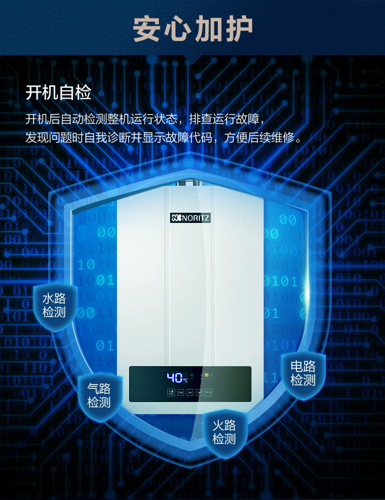 安全装置:熄火保护、过压保护、可复式空烧保护、水/气路过滤、熔断式过热保护、LED数码故障显⽰、断水保护、防雷击保护、双重燃气电磁阀等安全保护装置