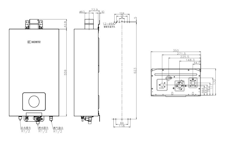 额定热负荷(kW)时产热水量(Kg/min):16(水温+25℃上升)