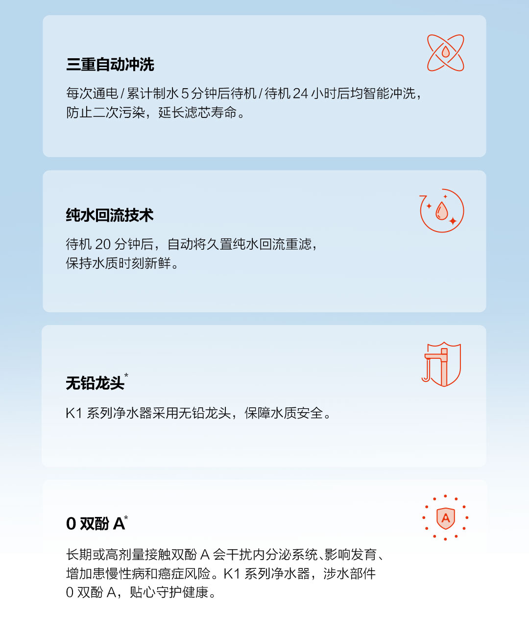 出水水质:纯水符合《生活饮用水水质处理器卫生安全与功能评价规范——反渗透处理装置》(2001)的要求。净水符合《生活饮用水水质处理器卫生安全与功能评价规范——一般水质处理器》(2001)的要求。