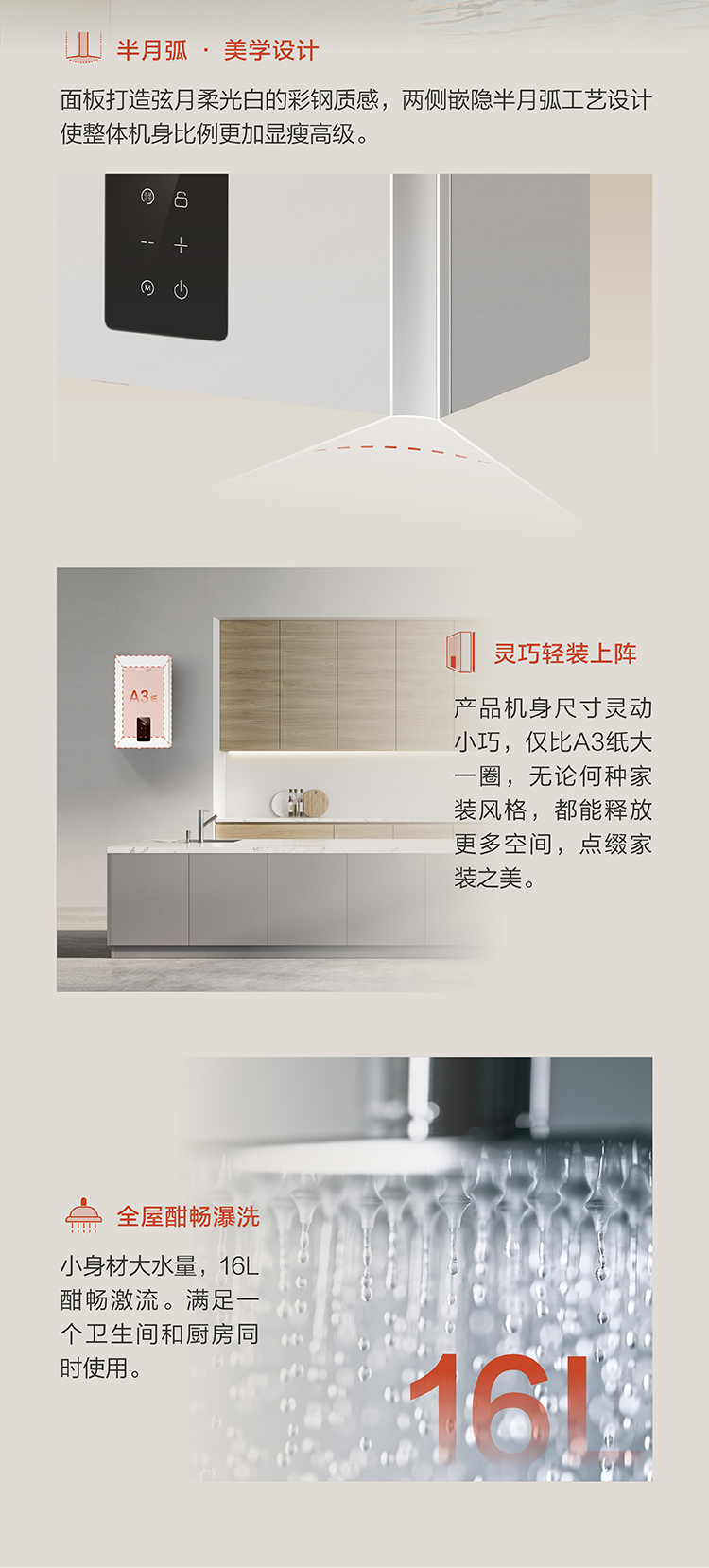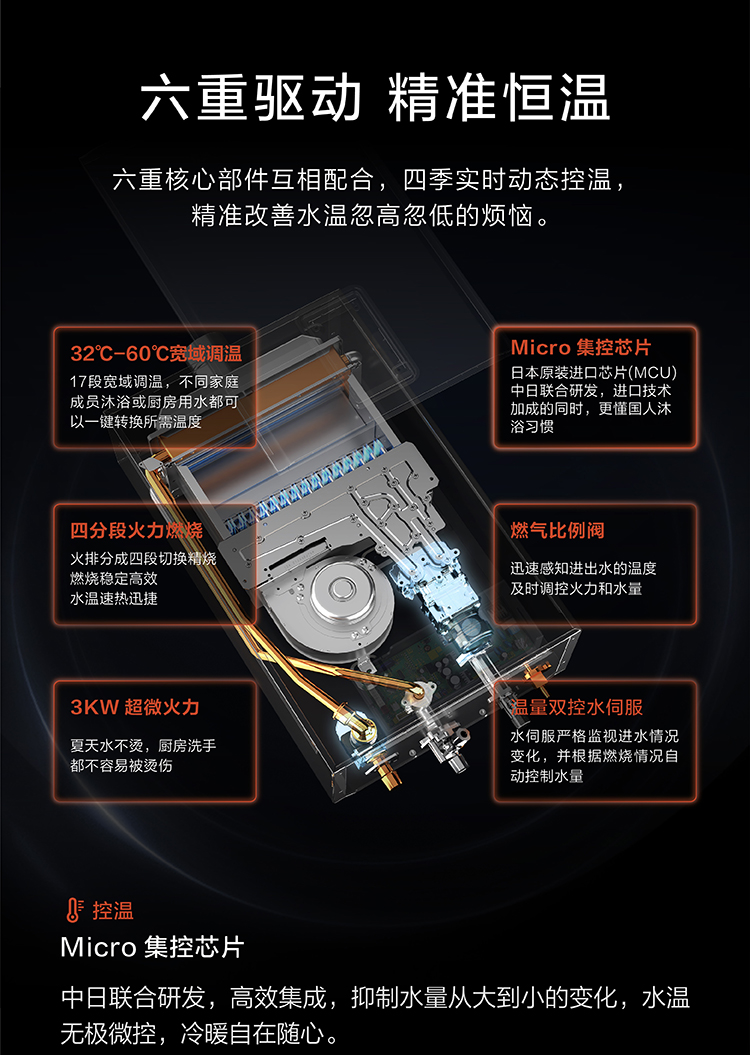 安全装置:熄火保护、过压保护、可复式空烧保护、水、气路过滤、熔断式过热保护、LED数码故障显示、断水保护、防雷击保护、双重燃气电磁阀等等安全保护装置
