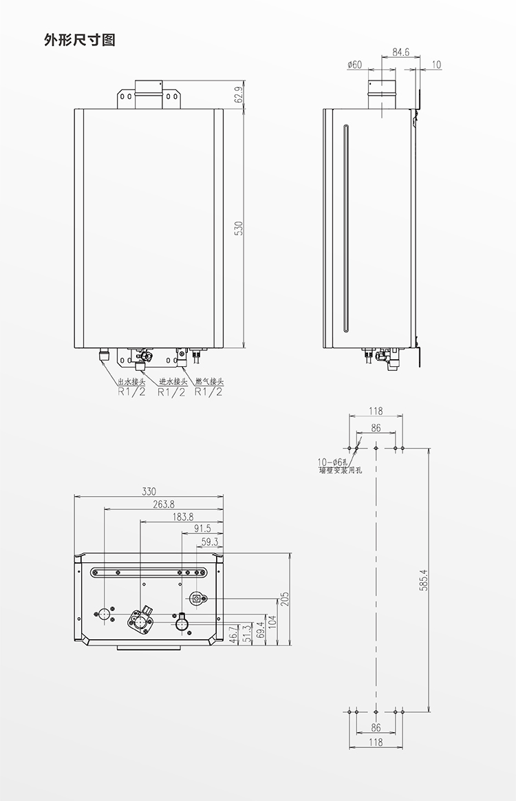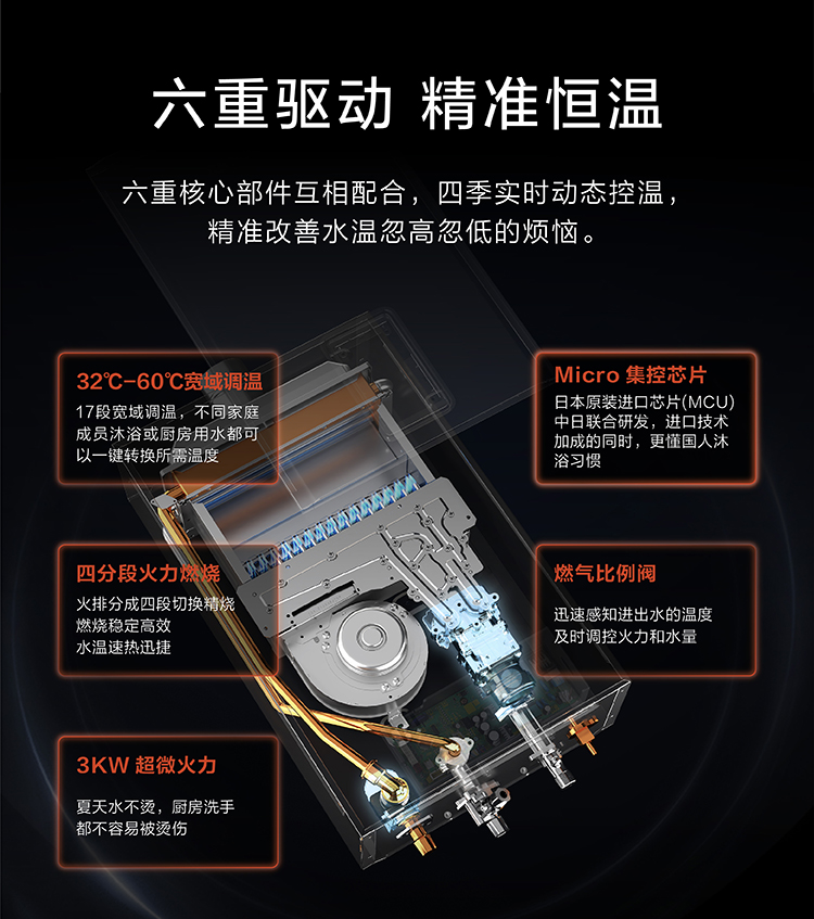安全装置:熄火保护、过压保护、可复式空烧保护、水、气路过滤、熔断式过热保护、LED数码故障显示、断水保护、防雷击保护、双重燃气电磁阀等等安全保护装置